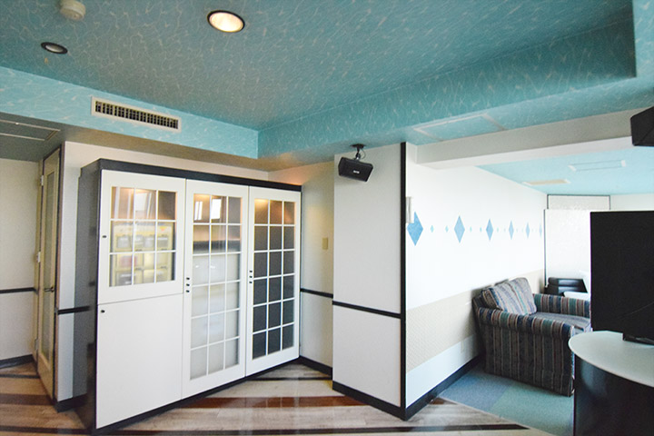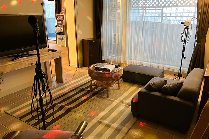 本格スピーカーから大音量のカラオケ スタンドマイクを用意しプロ気分 カウンターチェアーとマイクスタンドによるライブ気分 音声反応型ミラーボールによりライブ&ドライヴ感満点 60インチ大型テレビ導入 《※カラオケのご利用は朝9時~夜11時までとなっております》 |